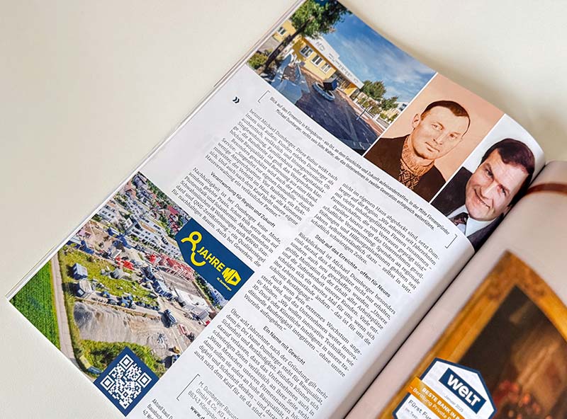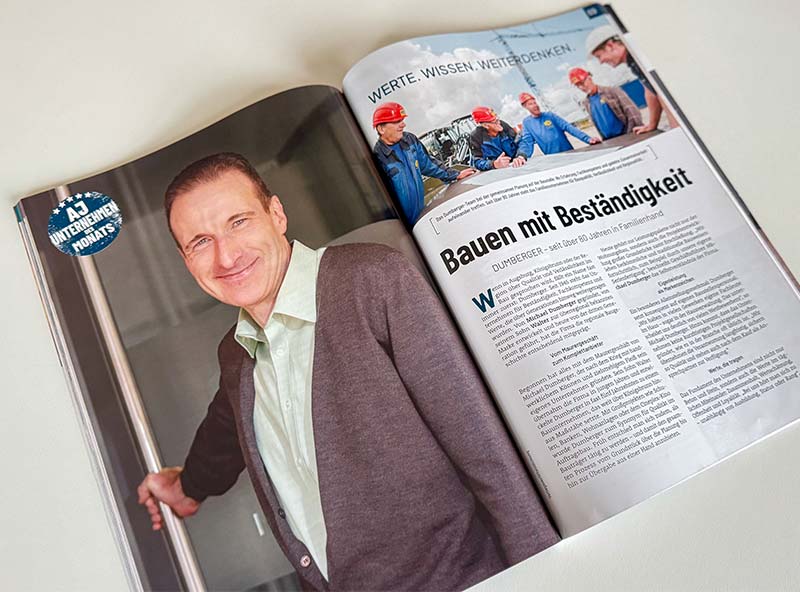 Anlässlich unseres 80-jährigen Bestehens wurde die M. Dumberger Bauunternehmung GmbH & Co. KG vom Augsburg Journal als „Unternehmen des Monats“ ausgezeichnet.
