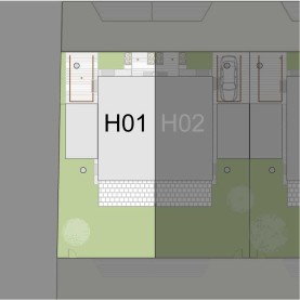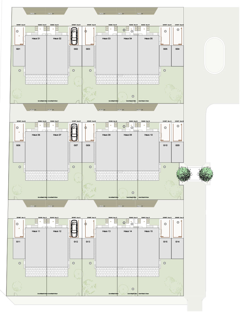 Große Garage (ca. 3,5 x 6 m) und ein PKW-Stellplatz zu jedem Haus