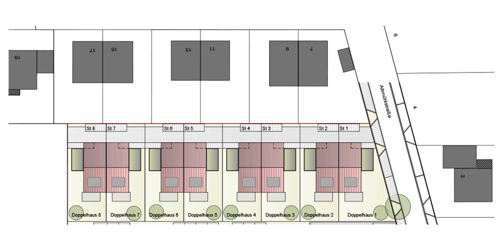 Der Lageplan der Doppelhaushälften in Schwabmünchen schafft eine klare und übersichtliche Orientierung im Quartier. Die Gebäude sind stimmig entlang der Altmühlstraße positioniert und fügen sich harmonisch in das bestehende Wohnumfeld ein. Durch die durchdachte Anordnung von Zufahrten, Wegen und Freiflächen entsteht ein strukturiertes und zugleich angenehmes Gesamtbild.