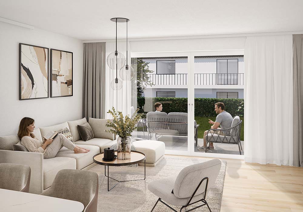 Für ein perfektes Raumklima zu jeder Jahreszeit sorgt die zentrale Wohnraumlüftung mit Wärmerückgewinnung, während die energieeffiziente Fußbodenheizung – gespeist durch lokale Nahwärme – für behagliche Wärme sorgt.